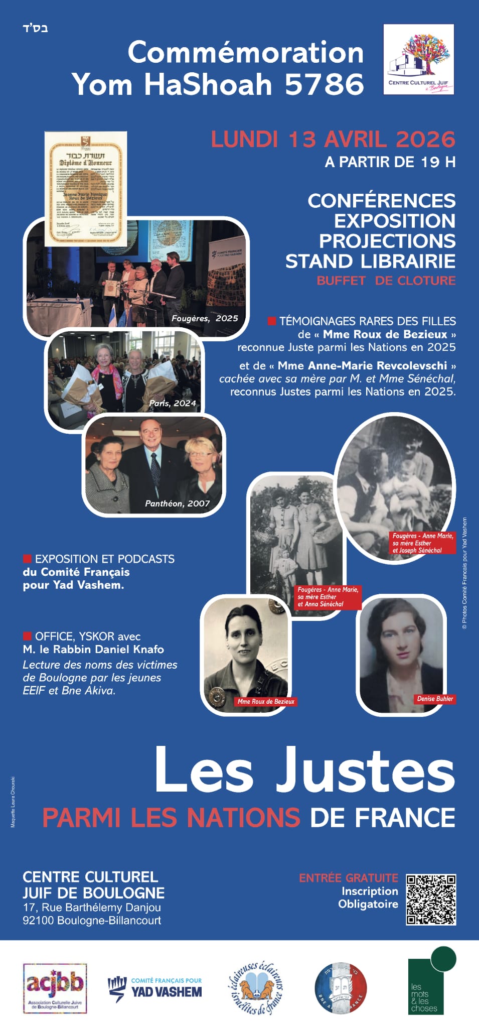 Commémoration de Yom Hashoah au Centre Culturel juif de Boulogne, en collaboration avec le Comité Français pour Yad Vashem sur le thème : « LES JUSTES PARMI LES NATIONS DE FRANCE ».